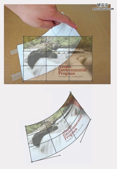 (三)封面圖片變形:選擇封面的圖層後,應用“編輯>變換>變形(WRAP)”功能,你會注意到封面圖片也被分成了象白紙那樣的平均九格。通過調節節點的手柄,使封面的變形與上方模板上白紙的變形一致,可通過九個格線來對齊。最後應用變形。