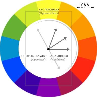 矩形選色法不僅是最復雜的,而且是最難搞懂的。但它的挑顏色卻相當簡單,只需畫一個一個長方形的撐住色相環;這樣,矩形的四個角就會各壓住一個色相。然而,重點是變化。一不小心,你的方案會花得堪比彩虹。盡量讓一種顏色壓住別的,並且讓您的用色方案盡可能簡明。我發現如果多種顏色相對不飽和,那麼處理起來就會容易許多。