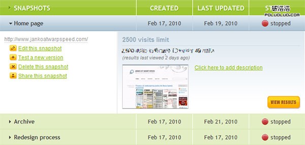 CrazyEgg應用了整行選擇的方法展開當前選中行的詳情(稍後我們會談及該模式),鼠標懸停的行會高亮顯示。我很喜歡他們對這塊區域以及其他的應用的設計。