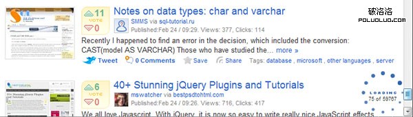 與分頁相反,連續滾動是一種新型的數據顯示方式。這種方式不需要選擇特定的數據類型,新的數據被加到列表裡。在加載的時候顯示進度,如下例所示,在dzone.com裡,進度條顯示有多少項已經被加載。