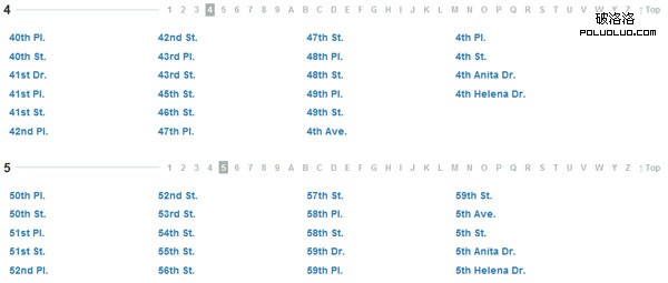 Product Planner 采用了標准的分頁顯示,有頁碼數字,有上一頁下一頁。但是,你能告訴我第2頁是什麼? 第3頁?當然你不能。不用擔心,標准分頁可以得到改善。如下所示,通訊錄很龐大,他們使用了數字和字母來分頁。在這個例子裡顯示所有的頁和隱藏頁一樣好。你可以以此類推應用到其他條件相似的表格。如果表格以日期來分類,你可以以日期范圍來替代傳統的分頁數字(如第1頁可以寫成2.10-2.12,等等)