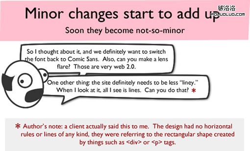 客戶:我想了一下,決定把字體調回Comic Sans. 另外,你能搞一個鏡頭光暈效果麼?它們看上去非常Web2.0. 另外,這個網站絕對不能太“線條化”了。當我看這個網站的時候,我看到的都是一行一行的。你能處理一下麼?