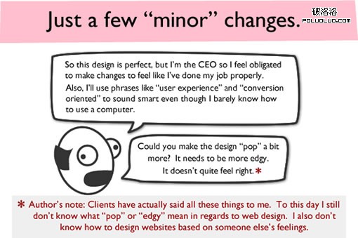 客戶(想):這個設計很完美,但我作為CEO,有責任提點改正意見來讓自己感覺自己的工作做到位了。同時,我得用“用戶體驗”,“轉化導向”這樣的術語來顯得自己聰明些,盡管我幾乎都不大會用電腦。