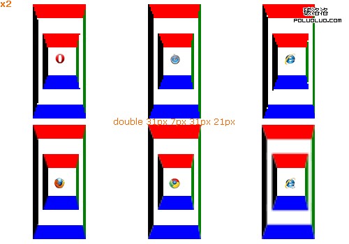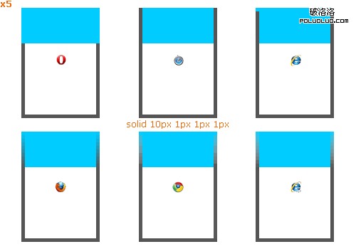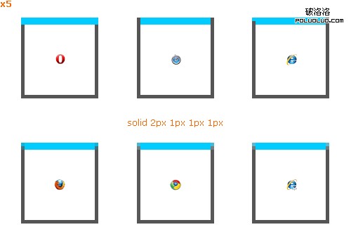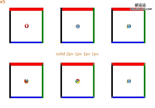 首先看下面這張圖,六種浏覽器裡顯示了一個20X20的DIV,其邊框為top:2px,其余1px。似乎沒有什麼不同。這是由於1px的細微讓我們沒有在意。(事實上這整個問題我們本來就不需要在意~)