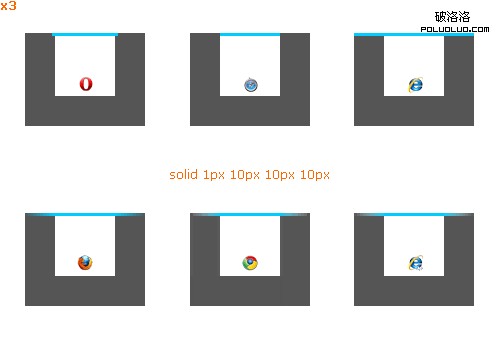 假如顛倒下會是怎樣?3邊加厚,結果是有些出乎意料的。opera的表現很詭異,換句話說,它頂上的那條線,在上面的例子裡“優先”了只是一種巧合。IE表現的更加像opera,而不是它缺胳膊少腿的一貫形象。safari貫徹始終,並且,下面三個家伙的結果也是意料之內的。