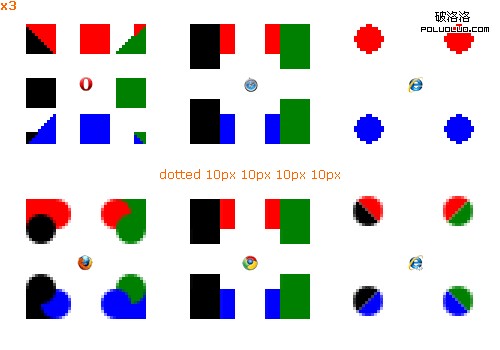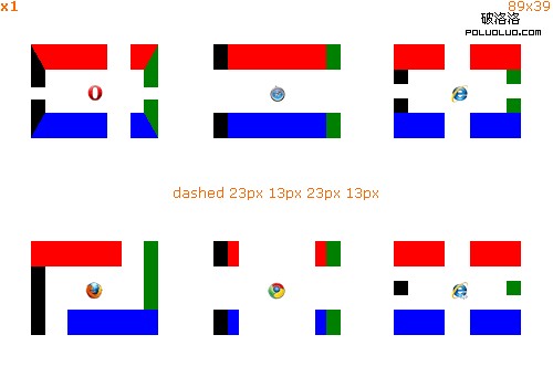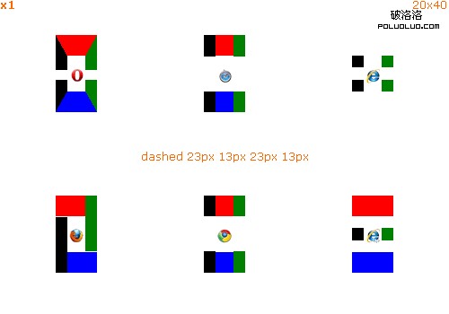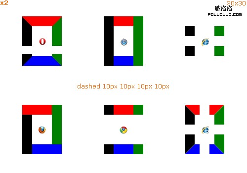 dashed又如何?同是webkit,表現卻並不像剛才的dotted那麼相同。ie8依舊很詭異,只有4個點,上下的線消失了…事實上,之所以這裡把DIV加長到20×30,是因為,20×20,不夠ie8顯示這麼寬的dashed線型,那4個點也會消失的~