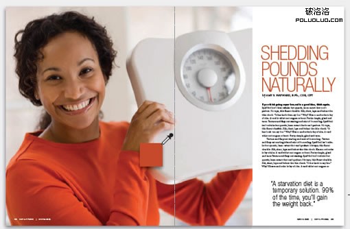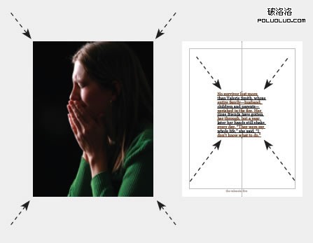 這張圖片拍攝得非常不錯,光線照在她的臉上,而其余部分則與黑色背景結合,非常准確地傳達出孤獨、悲傷及失落的情感。圖片的兩種顏色間斷地用在引言文字的每一行中,這個引言文字沒有傳達出聲調的不同,但卻增加了情感上的共鳴。上圖中,引言放置在一大片灰色文字的中間,引言同樣顯得很“孤單”。引言的放置模仿了這張呈對稱構圖的全出血位圖片。而且象一個靶心,讀者的眼光無法忽略這一段文字。