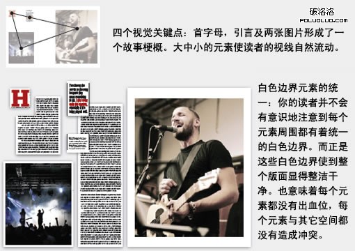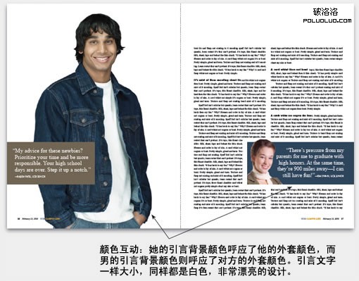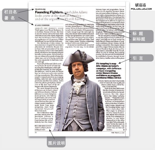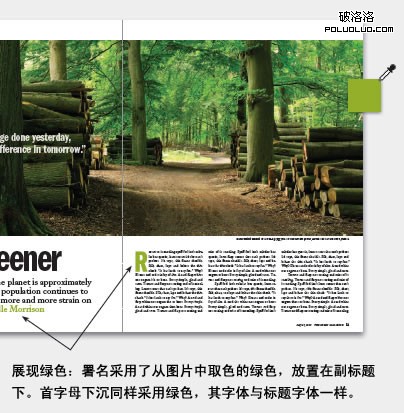 自成一格的故事:毫無疑問,這是一個引言,因為這段話是從正文裡摘引出來的,但給它加上標題、首字母下沉的版式、出處及圖片,就變成一個不折不扣的小故事,這種處理手法增強了所引用資料的權威性及可信性。當引言運用得當時,它就可以發揮概括、加強訴求及增加版面吸引力的作用。如果這種設計手法形成一個系列,則讀者在閱讀整篇文章時都會賞心悅目。