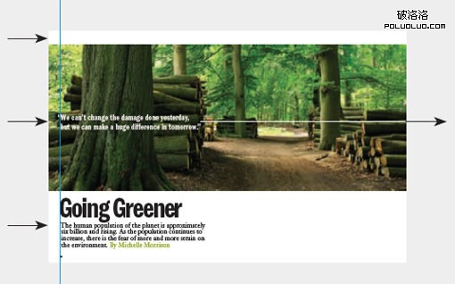 現代風格版式:泥濘的山路及雜亂的森林樹木都給人一種野外鄉村的感覺,不過在這個版面中,整個設計給人的感覺卻相當的干淨整潔。圖片及兩個白色的水平空間使到觀看的眼睛一覽無遺地從左到右,沒有任何的障礙物。為了呼應這種版面結合,引言也設計得傾向於水平狀,並且采用標題字體,引言與下方的標題及副標題均對齊。正是這些設計使版面顯得干淨整齊。