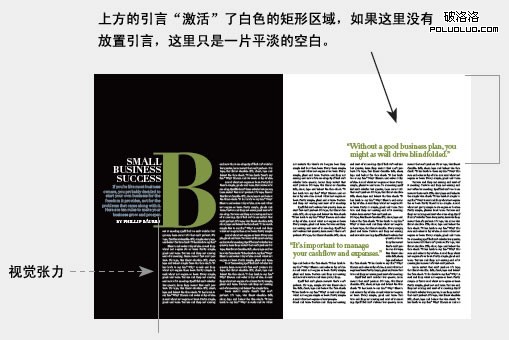 很多雜志期刊都有相對固定的版式,而引言則可以成為一個很靈活的因素來活躍版面。在下圖中,粗糙的字體與嚴謹的排版形成了視覺上的對比。引言成為設計中一個重要的元素,使版面建立了貫穿整篇文章的視覺感。