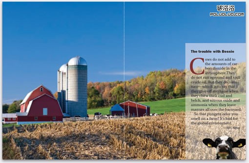 (引言文字為:貝茜的煩惱 奶牛並不會增加大氣層中二氧化碳的總量。它們也不需要在地上到處跑而消耗原油。但它們在反刍!而據說在它們咀嚼反刍食物及打嗝的時候就會產生甲烷,而當它們在農場上排便時,還會產生一氧化二氮及氨氣。所以你是否在農場上聞過這些刺鼻的味道?這並不利於全球環境。)