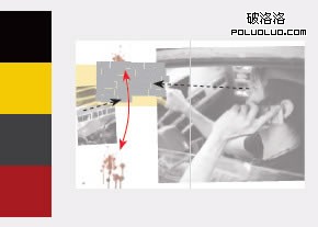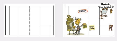 插入“障礙元素”是一種能夠使版面顯得很有生氣的技巧。一般我們在開始時以網格及參考線定下文字放置版式(上左)。然後將各種元素加進去並且與這些柵格線重疊(上右)。在這些例子中,幾個圖片元素使文字形成包圍狀。而“辦公用品”風格的引言則可以根據版面實際情況靈活變寬或變小。