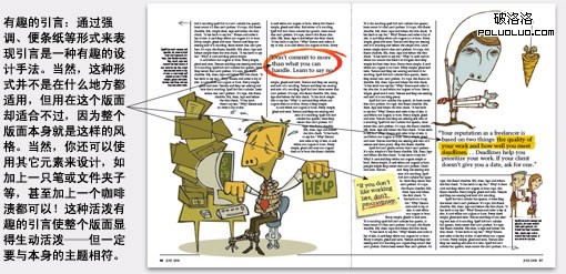 引言有很多功能。最基本的功能就是填補頁面的某些空間,或者在一篇很長的文章中插入引言,打破版面的沉悶結構。但引言的功能遠不止這些,在版面中巧妙使用引言,可以使版面顯得更生動。這些引言能夠引起那些匆匆浏覽的讀者的注意力。其實引言本身就構成豐富的信息,因為它本身就具有一種概括、點明主題、揭示文章意義等作用,這些引言本身就構成一個小故事。運用得當的引言本身就是一篇文章的精華所在。對於設計師來說,它也是一個非常有趣的設計元素。