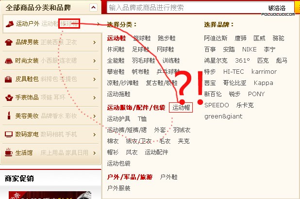 你點擊了半天,發現沒有反應,你再仔細一看,他引導你打開了整個“運動戶外”下的二級分類….這個時候,你的鼠標需要在做一次長途奔襲,去彈出來的彈層裡尋找“棒球帽”,當然,你還得小心點別奔襲到界外,不然整個彈層就關閉了,你需要再來一次(圖中虛線)。