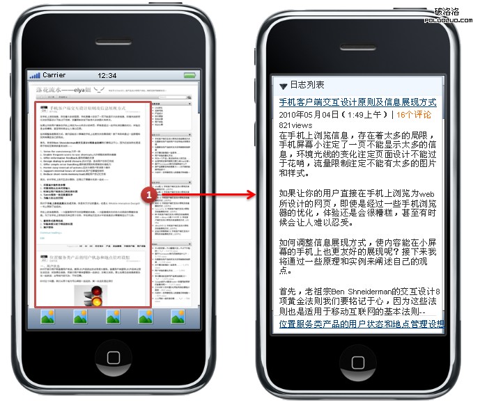這個方法是加載了頁面全局之後,點擊局部放大成右側的詳細內容。當然這對沒有使用過web而直接使用wap的人來說可能會造成一定的負擔,因為小屏幕確實無法看清詳細的文字。