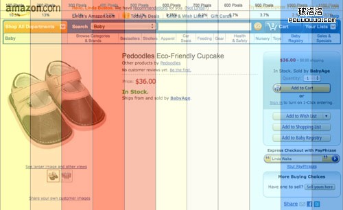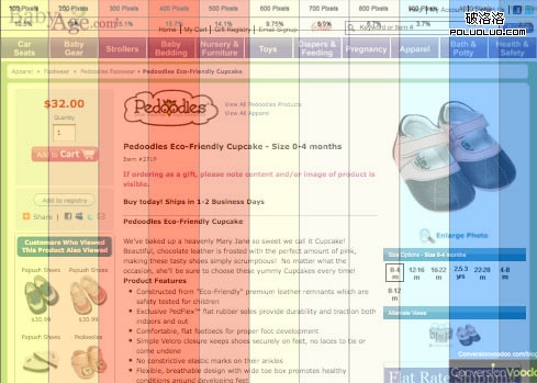 這個發現很讓人吃驚,因為貌似99.9%的電商網站都把(加入)購物車按鈕放到右邊,你原以為用戶已經被”教育”的會在那個位置找”購物車”按鈕.但是根據Jakob Nielsen最近那篇發現在水平方向上,注意力分布更靠左邊的研究報告,BabyAge的這個測試結果又好像不那麼意外.