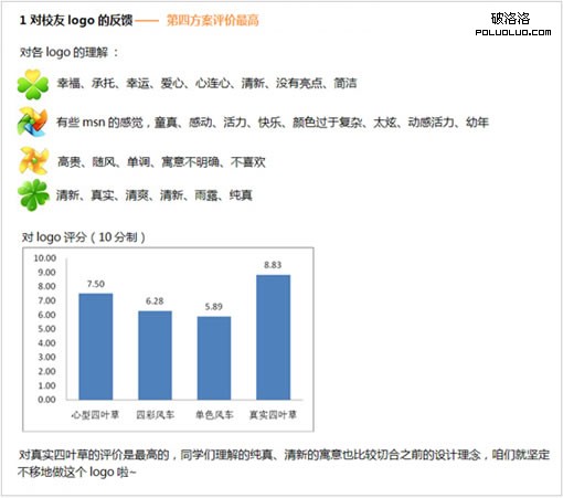 方法:以用戶訪談的形式給20名在校大三以上的本科生和研究生看logo的設計稿件(包括環境使用效果圖)請各自說出自己對各方案logo的理解並給出自己的評分(10分制)