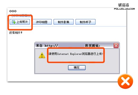 一個模態的警示框,赫然告訴你,你想在這裡上傳相片,根本不該使用除了ie之外的浏覽器!除了事先不打算通知你之外,同時也沒的商量,因為我沒有給你提供別的替代性方案和其他選擇。