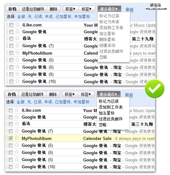 下圖則是已有選擇郵件的時候,操作項全部激活為可用狀態時的情況。對比上一張圖未激活的狀態,可以注意到除了激活與否的狀態差別,還有其中的 “加注星標”功能在初始激活狀態下是只有加注而隱藏了刪除功能的、充分考慮了加注和刪除功能的互斥性而予以隱藏。