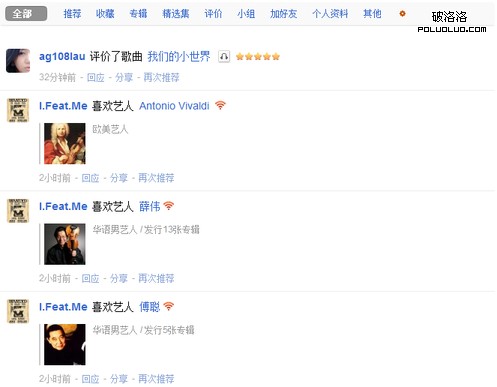 同時 Lala.com 幾乎不重視用戶之間的互動,A 與 B 之間僅僅是互相關注的關系,能獲知的信息僅僅是你聽了什麼,我聽了什麼。