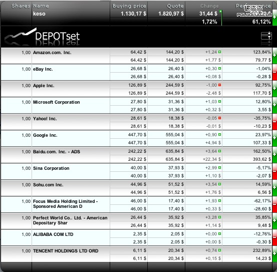 總共13只股票,各買一股,總投資1130美元。截至今天,其中8只股票比兩年前價格上漲(按漲幅排序,依次是騰訊、百度、亞馬遜、蘋果、完美時空、 Google、搜狐、微軟),5只股票下跌(按跌幅排序,依次是分眾、雅虎、阿裡巴巴、新浪、eBay)。但現在這些股票的賬面價值是1821美元,我兩年淨賺691美元,回報率達到61%。