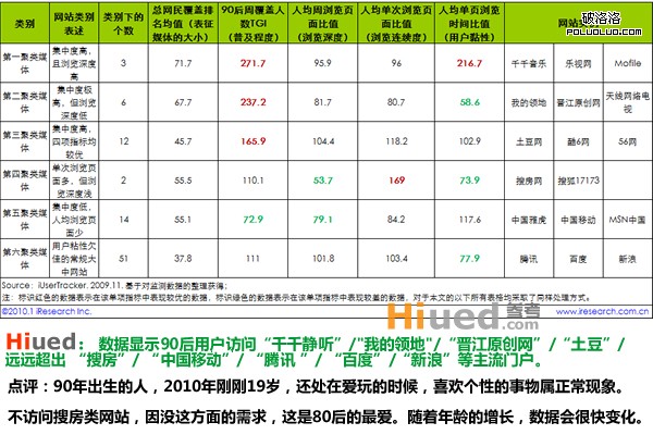 其中前3類都是90後很集中的,但是浏覽深度有所差異,在營銷選擇的時候需要有所側重。後3類是90後活動並不集中的媒體,在常規的大網站90後浏覽時間都偏短,可能90後對成人社會的很多問題並不感興趣,但是又有好奇,最後淺嘗則止。
