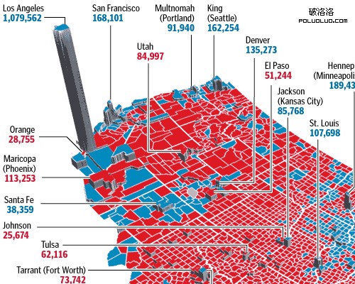 一旦選舉結束,國家的投票方式也被繪制成地圖。比較有趣的一件事是華盛頓郵報的地圖,它使用flash提供一個360度關於選舉趨勢的視角。整個競選的結果有效地總結在一張單一的圖上。