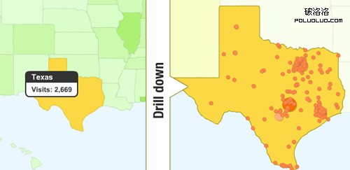 Google Analytics在其世界地圖應用中使用了drill-down模式。通過點擊一個特定的國家,地圖自己會重新定位到該國,而同時屏蔽掉其他國家。在州和市的級別上可以做相同的操作。這使得用戶在沒有被信息淹沒的情況下能夠控制特定的數據信息。