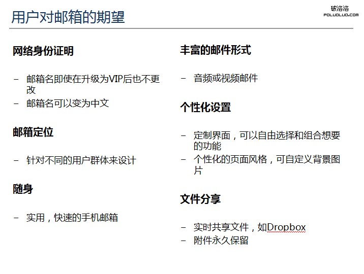 - 這一結果對我們的啟示是:優秀的郵箱,必然要反映用戶最核心的需求。那麼,用戶究竟需要哪些功能呢?