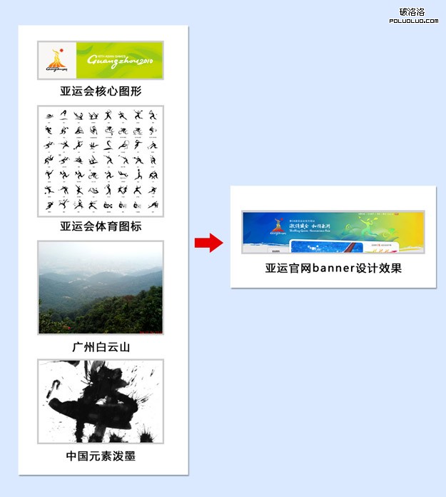 以上是頂部banner的設計思維圖;作為一個網站最顯眼也是最能體現整個網站形象的一個區域,我們采用了具有中國特色的潑墨形式,並將亞運會VI圖案、運動人物標識、連綿的山脈等元素組合在一起。右側運動人物標識還有一個特別之處,我們設計了多套不同的運動圖案,每次訪問頁面會隨機打開其中一張,力求讓用戶每次訪問都有些不同的感受,以增加官網的層次及趣味性。運動人物下方的抽象連綿山脈,則是使用亞運核心圖形重復排列構成,以突出廣州特色——白雲山。