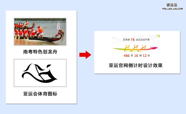 倒計時區:前面提到,倒計時區域的設計相比舊版需要做的更加的突出。因此我們摒棄了一般的倒計時功能所特有純數字、呆板無聊的特性,結合真實的劃龍舟圖片和亞運體育圖標中的龍舟,設計出了這個倒計時的形式,並且用FLASH制作出龍舟劃動的動畫效果,更加能夠成為用戶目光的焦點。