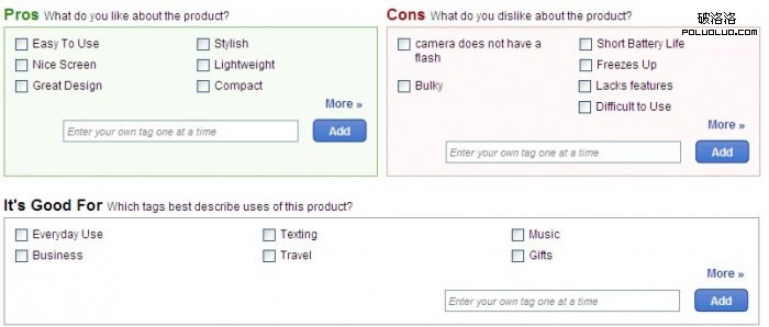這是美國著名的比較購物網站Shopping.com的點評系統的部分截圖,其前身是一個購物搜索網站,後期的時候收購了當時美國火爆的點評網站epinions.com。在收購之後他對epinions的點評系統做了改進,整個表單包括打分(5分制)、撰寫標題、以checkbox的形式選擇出商品的優缺點與最佳用途(允許自定義)、詳細描述、是否推薦給朋友。而在前台展示的時候shopping.com對checkbox中的標簽根據用戶選擇的熱度只顯示最熱的部分。