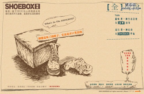 Shoebox, 國內的一個年輕人鞋品牌,整站使用 Flash 以彰顯時尚感。素描圖案,舊報紙背景構成 Shoebox 理念,生活的品位,簡單,運動,時尚。