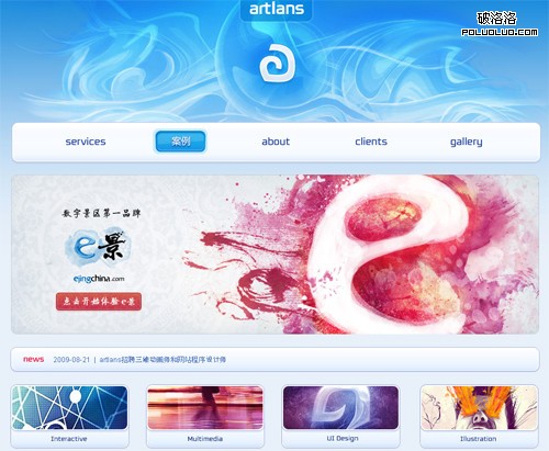 Artlans, 是一個交互設計工作室,主要是菜單按鈕,點擊按鈕,以及語種轉換按鈕。設計工作室一般不願整站使用 Flash,而是在某些主要的位置,借 Flash 顯示他們 Flash 技巧。