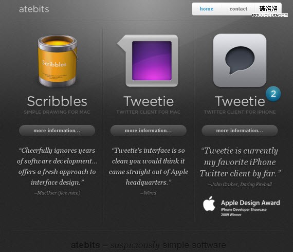 網頁制作poluoluo文章簡介:優雅的設計貫串蘋果所有的產品,也包括網站,不僅蘋果自己的網站,世界上有無數模仿蘋果的網站設計,然而是什麼構成了蘋果式網站設計風格?淺淡的配色,大面積留白,清晰統一的導航,雅致的圖標,還有,拒絕使用 Flash,本文分析了 Web 設計中蘋果風的構成元素,並提供
