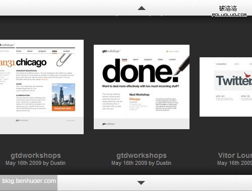 接下來看看 QuickSnapper 的滑門。這是一個完美融入頁面整體布局的十分好用的垂直滑門。滑門內容中有大量截屏圖,內容被有序地組織起來。這個滑門最贊的地方就是上下方的按鈕導航。按鈕寬及整個滑門,大的按鈕讓“推拉”滑門更加容易。