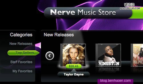 與上面的例子對應,滑門不僅能用於大容量信息的組織,也能為用戶浏覽大量產品條目提供方便。 SourceBits (見下圖)使用了多層滑門(一個水平的,一個垂直的),用唱片封面作為導航條目。