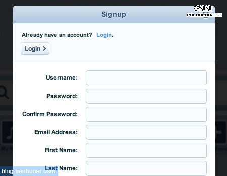 Grooveshark 整個站點的每一個頁面中,這個漂亮的登錄窗口都觸手可及。注意,點擊登錄( Lodin> )按鈕後並不會載入一個新頁面,而是直接把注冊表單替換成了登陸表單(使用了手風琴效果)。非常方便,非常友好的用戶界面。