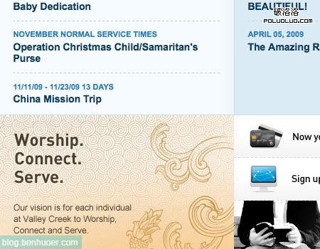 使用網格一般是因為你需要在一個很緊湊的區域內放置大量內容。你想要創建整潔有序的網站布局,但是又不能隨意添加很多留白來區分區塊。如此的話,你就需要使用不同背景來區分網格區域。沒了網格間的大量留白,只要網格內還有少量的內邊距,也可以看起來很不錯。Valleycreek.org 就用了這種戰術,盡管已經有一條細線來分割網格區域,背景色的差異還是被用到,以提供更明顯的區分。