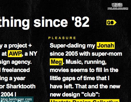 Sursly.com(貌似被牆,請點擊這裡代理訪問)的整個作品集站點都基於漸進布局。您應該能注意到,頁面右上角有一個“GO”按鈕,每一頁面都是從上一頁面中的GO按鈕鏈接過來的。這種頁面之間的漸進系統代替了傳統的導航和菜單。當然,這樣做也有一個很明顯的缺點:導航的交互性下降了,用戶只能按照網站建設者想要的順序獲取內容。