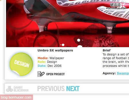 Danny Blackman 的作品集也是僅通過一張漸進式布局頁面來實現的。各塊元素相互獨立,在一張頁面上垂直展示。相鄰元素之間有滾動按鈕,每個元素都有返回頂部的按鈕。菜單或所謂導航還是沒有被使用。