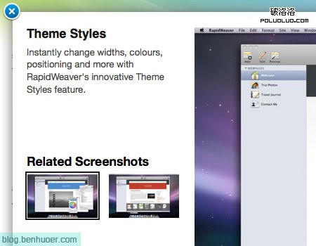 些文字介紹。你能注意到一個小按鈕被用來顯示/隱藏介紹。他同時也提供到更詳細介紹或者更大預覽圖的鏈接。在一個小小的手風琴裡當然不能塞進特別特別多的