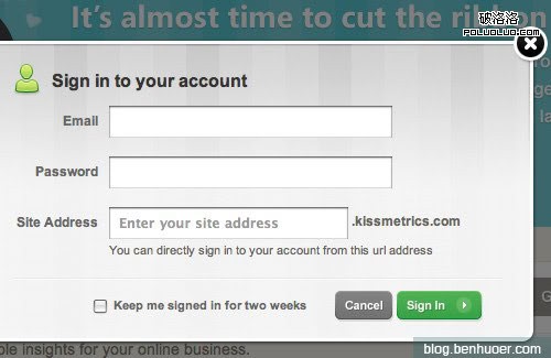 意力集中到浮窗上,然後暫時忽視掉背後的頁面。另外,也能增加窗口和頁面之間的深度感和區分度,讓人在視覺上覺得這窗口確實是漂浮著的。注意看下面的例子(KissMetrics),半透明的黑色背景讓頁面消隱,有助於登錄浮窗暫時成為視覺重點。另外,取消和關閉窗口的按鈕也設計得很好,夠明顯,夠漂亮。