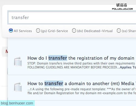 最近還比較流行的一個技巧和上面談到的有點類似:在下拉列表裡顯示搜索結果。 Media Temple Knowledge Base 就使用了這一技巧。他們沒有使用一個新頁面來顯示用戶的搜索結果,搜索結果在一個下拉列表裡隨著你的輸入而實時變化。不過,請注意,完整搜索結果頁的鏈接仍然存在,您若要在自己的設計中使用這種設計,還請不要忘記這一點。