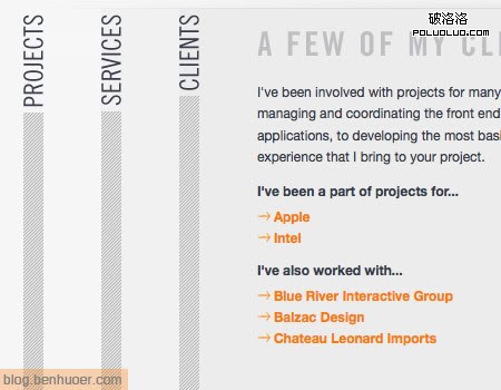 簽卡是垂直方向的)。請注意看他的標簽卡,每個標簽卡之間的距離很大,這些標簽卡,或者說標題,並不像上一個例子有那麼明顯的區分,設計師利用了留白來將