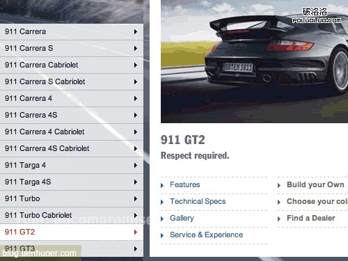 的主頁提供一個多級菜單,讓用戶不用一次點擊就能快速了解他們生產的所有汽車。第三級菜單中,所選汽車的信息被直接提供:包括圖片、許多鏈接、以及其他關於本車的快讀信息。當然,這個更大的區塊就是一個巨大的可點擊區域。所有細節和特別介紹都直接鏈到相應頁面。要了解究竟是怎麼回事,就點擊下面的圖片自己去看看吧!