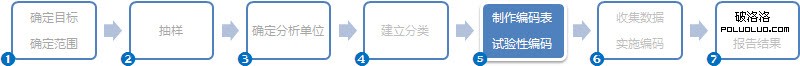 在編碼表制作好後,抽取50-100條分析單位(如100條反饋)進行試編碼(coding),以檢驗是否夠細夠全。當然了,在實際實施編碼(第六步)過 程中可能發現編碼不夠用的情況。此時只能新增編碼,並對該分類下的所有分析單位重新編碼。所幸的是——也是內容分析的優點之一——即使發現問題,能在不影響數據本身准確性和完好性的情況下彌補錯誤。不像問卷調研或現場實驗,一旦實施,有錯誤也無法彌補,只能拋棄數據。