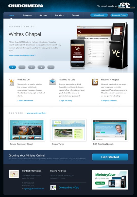 先來看看Church Media Group’s website,這是一個很好的例子.頁頭和頁腳都使用較深的背景色,內容區是白色.通過這種差異,可以很明顯的突出內容,並表現出它的重要性.如果我們再深入點看,在內容區域也有不同的背景色對比:”案例”部分使用了淺藍色.正因為它與其他內容部分的對比很小,表示兩個部分是有關聯的.