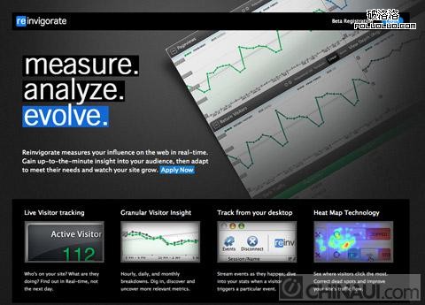 Reinvigorate用了 “measure. analyze. evolve.” 三個大大的字首先引起你的注意,大字下面就是描述文字,加一個”下一步行動”鏈接