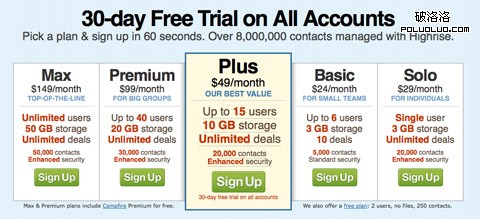 Highrise的價格清單對最受歡迎的那一項使用了突出的設計,幫助你選擇它.